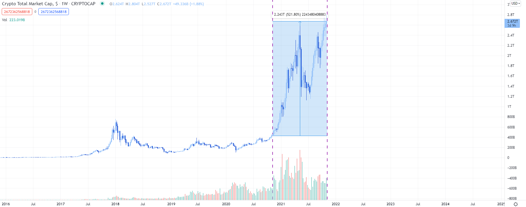 Examining total crypto cap metrics, one would be forgiven for assuming that BTC is leading the current charge, as the market recorded yet another week of growth, rising 3% to a $2,7T valuation – rapidly closing in on the colossal $3T mark. All while BTC remains below May’s $64k resistance, and dominance recedes to 43% – down 4% from late October. To put things in perspective, the market’s valuation totalled $440B in November 2020, representing a YTD gain of almost 600%.