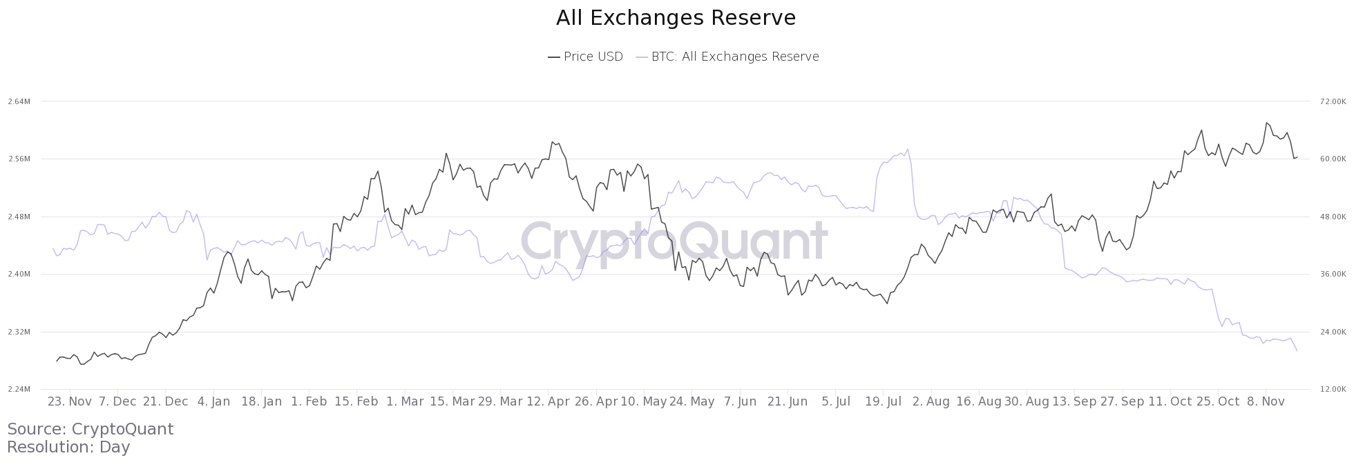 BTC exchange reserves provide insight into the volume of bitcoin currently held on exchanges, generally for trading or yield generation purposes, as opposed to those being stored off exchange for whatever purpose, including for long term hodling.